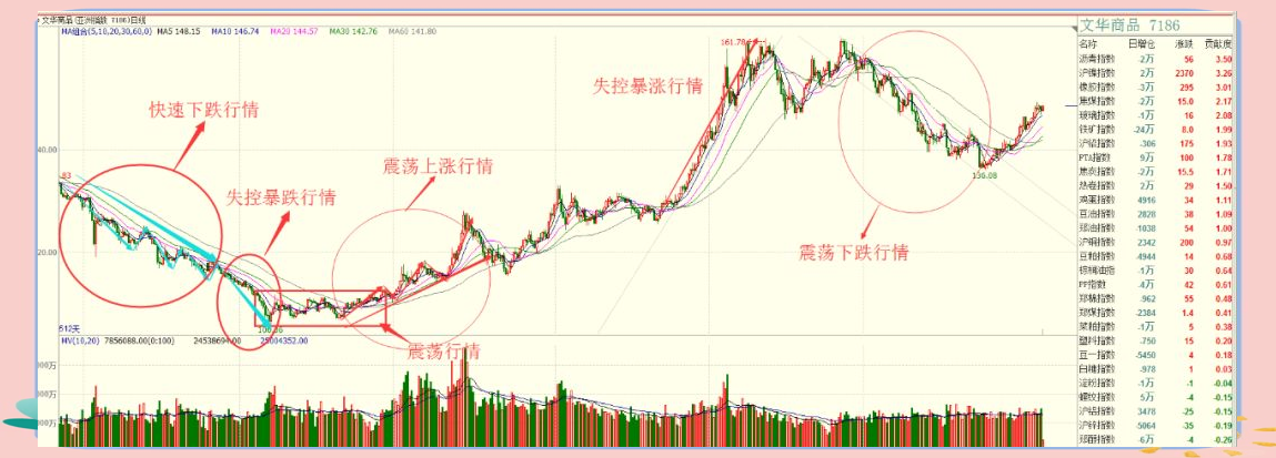 市场趋势通常可分为上涨、下跌和横盘三种。针对这些趋势,交易者应采用不同的策略。同时,行情的表现形式也可进一步细分,例如失控行情,其特点是上涨或下跌迅速,近似90度角;还有一种是斜率稍缓的行情,如70度角上涨或下跌;以及具有趋势性的行情和震荡市中的上涨或下跌。