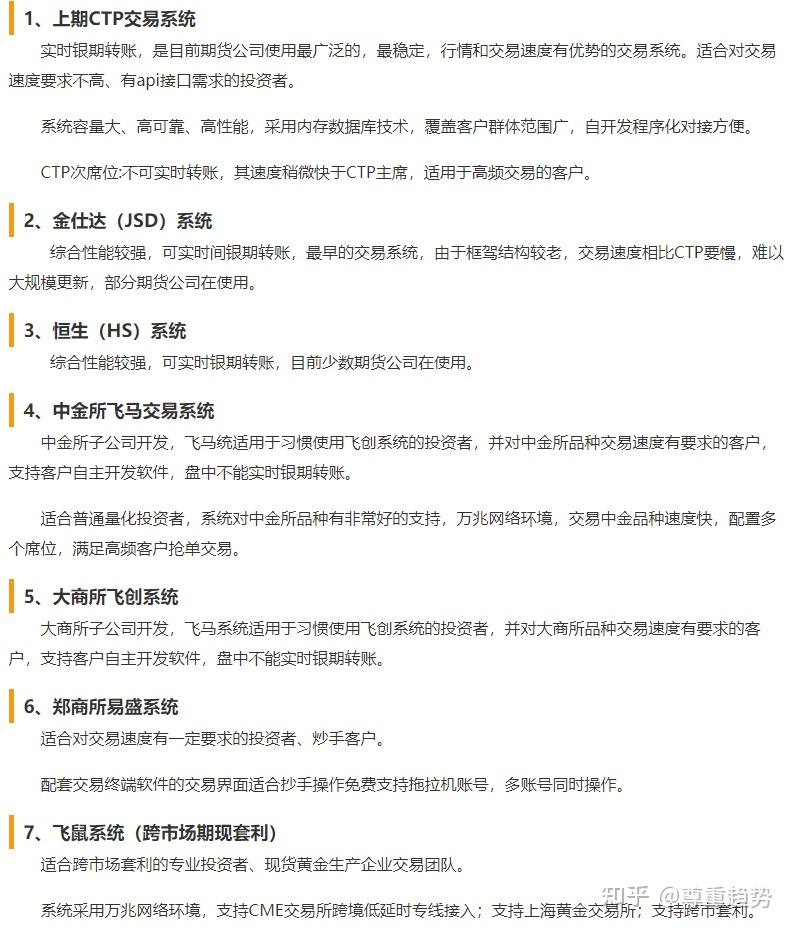 软件只是我们用于看行情走势的,交易系统才是把你报单传入交易所的关键,成交速度快慢也由此决定,市场上的主流交易系统有金仕达、恒生、CTP、易盛这四个,这里我重点说一下CTP系统,想具体了解其他的可以看下图,各有各的优势。