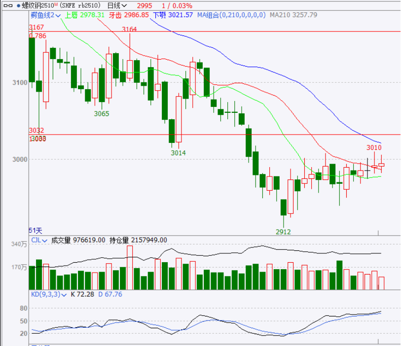 短线压力参考3000、3002或04;上方阻力参考3016或18、3023或28。短线支撑参考2993或90、2988或87;下方支撑参考2984~2975。上周五夜盘短线偏强窄幅盘整走势,盘面小增小减。今早盘继续挑战3000一线遇阻后回撤盘整,盘面小幅增仓之后减持。午后十二点窄幅整理依然承压3000一线,盘面持仓变化不大,交易量大幅缩减成地量,今盘面横向偏强整理上冲一下左侧高点3008附近遇阻,期螺盘面做多量能不足,强弱只是被动跟随原料端走势时强时弱,独立性和持续性较差,指向性也不是很明显(未能脱离底部区域)方向选择还有待观察。上周五分析提示“未来两个交易日盘面如果上冲3000稳不住谨防短线一定幅度回撤整理,目前暂看2970~3000的窄幅区间整理,待出方向”;关注日k线在均线系统中的变化寻求相对确定的方向。