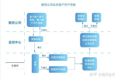 流程就是:客户通过期货公司app走开户流程,期货公司复核资料,然后提交监控中心系统检验再进入各交易所审核获得交易编码。开户流程10多分钟,一般下午14:00前走完开户流程当天夜盘即可生效交易。